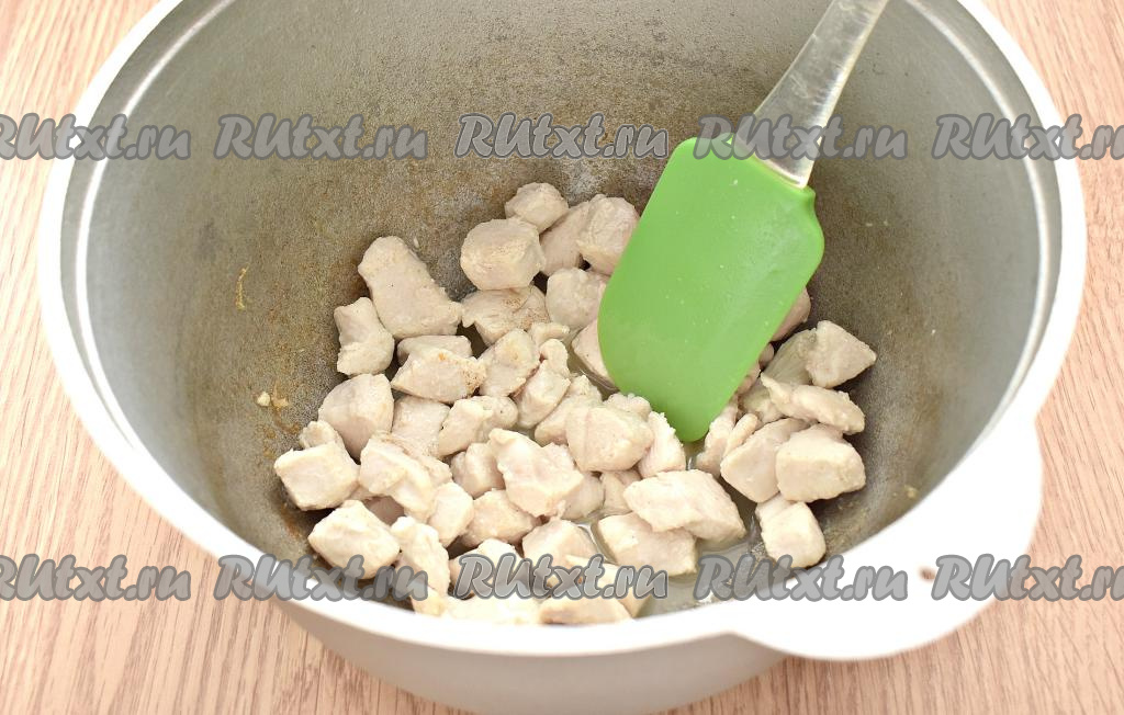 В казане разогреваем растительное масло. Делаем огонь сильным. Выкладываем в казан кусочки куриного мяса и обжариваем 3-4 минуты (до появления лёгкой корочки на кусочках со всех сторон).