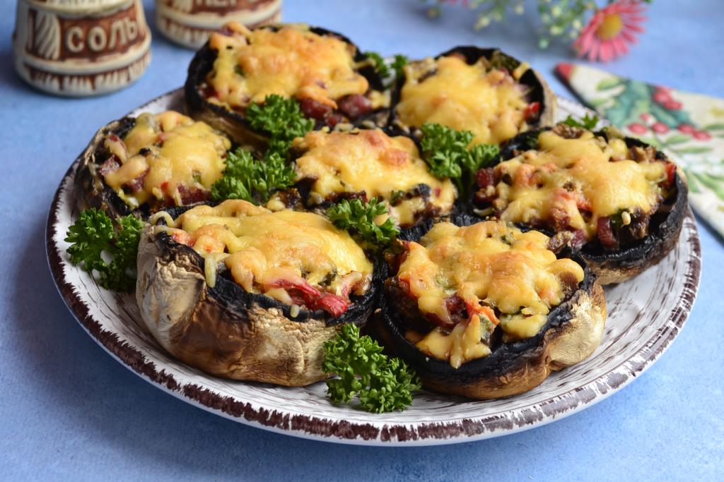 Запечённые грибы достать из духовки. Вкуснейшие, сочные шампиньоны, фаршированные колбасой и сыром, лучше подавать в качестве горячей закуски, но и в остывшем виде эти грибочки тоже хороши.