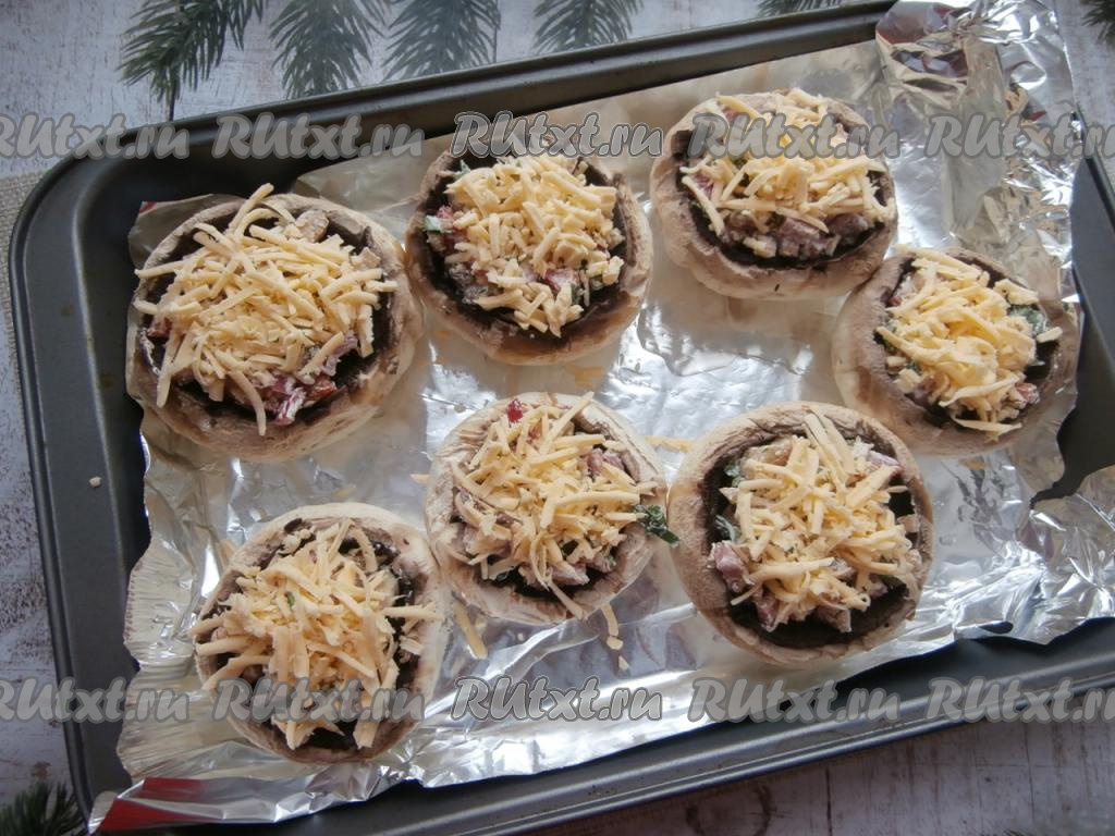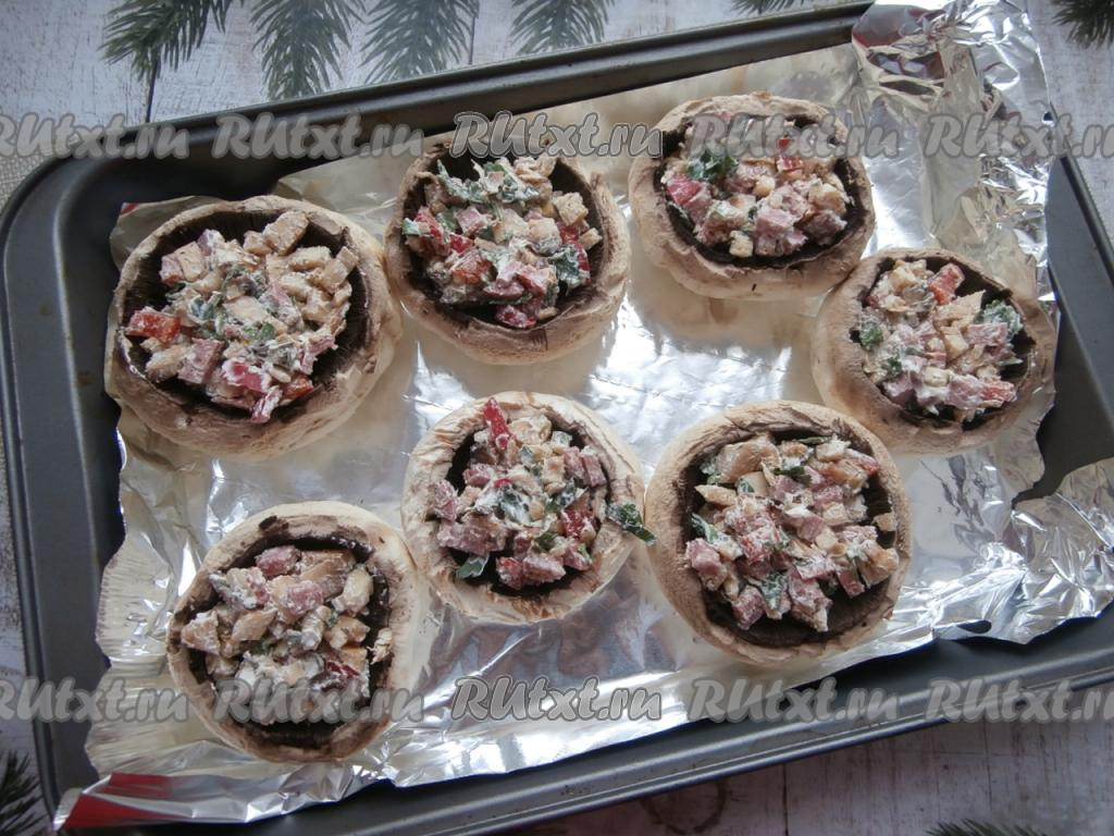 Шляпки разложить на противне, застеленном фольгой. Подготовленной начинкой нафаршировать шляпки шампиньонов.