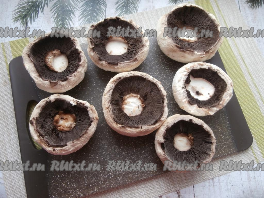 Удалить ножки у шампиньонов, внутреннюю часть шляпок посолить.