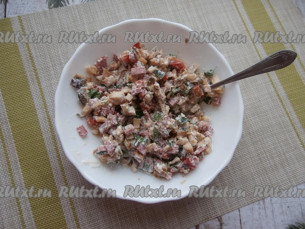В отдельную миску мелко нарезать ножки шампиньонов, туда же нарезать на маленькие кубики колбасу.