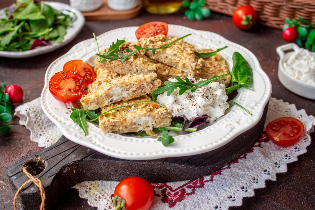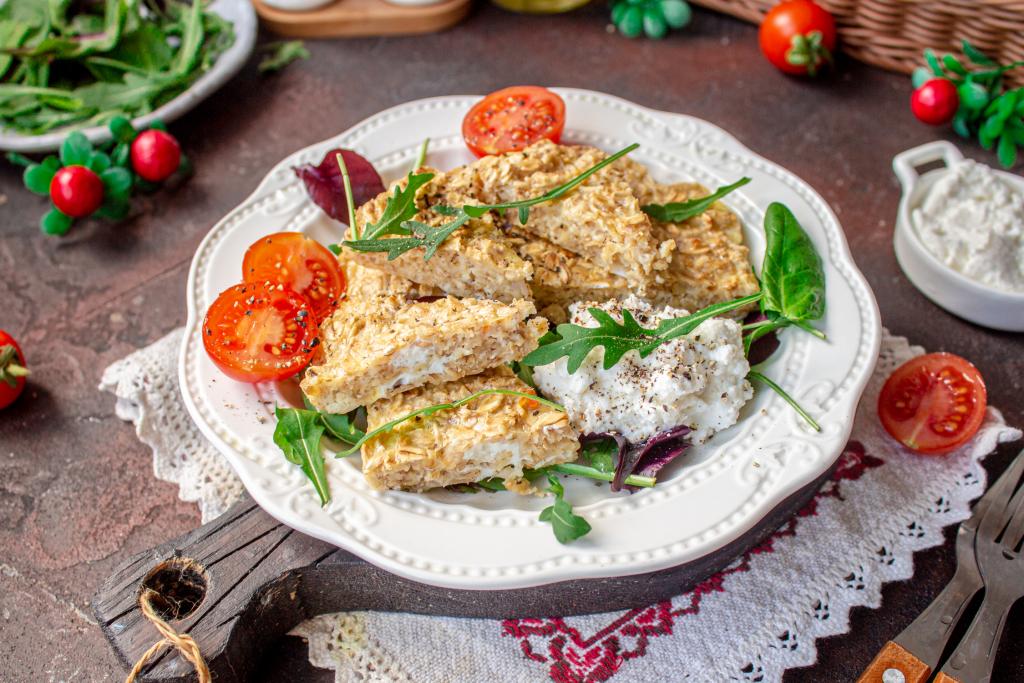 Достаньте готовый овсяноблин из духовки и подавайте его, смазав сладкой или несладкой начинкой. В моем варианте - это свежая зелень, немного мягкого творога и помидоры.