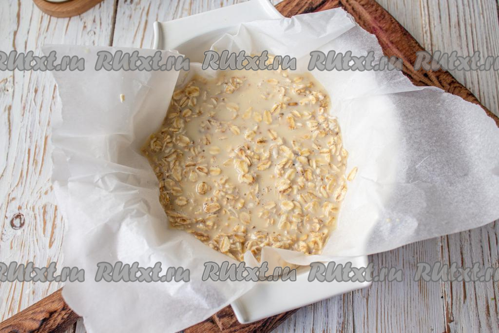 Круглую форму выстелите пергаментом и распределите овсяное тесто. К этому времени, у вас уже должна быть разогрета духовка до 200 градусов. Отправьте печься овсяноблин на 10-15 минут.