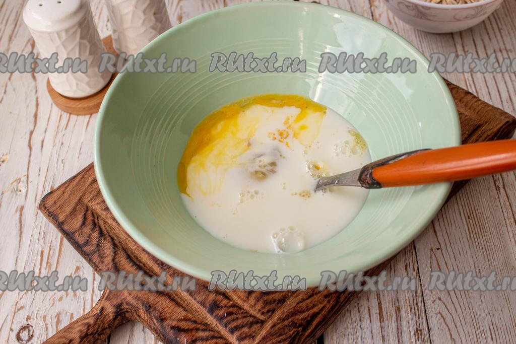 Влейте молоко и перемешайте венчиком (или вилкой) до однородности.
