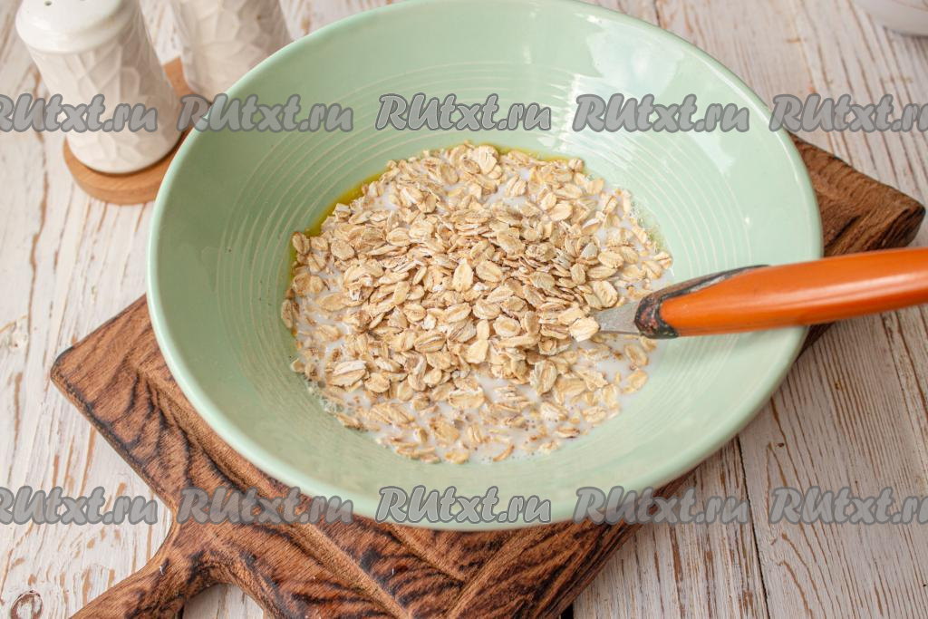 Всыпьте овсяные хлопья, перемешайте и оставьте на столе минут на 10-15, чтобы хлопья немного набухли.