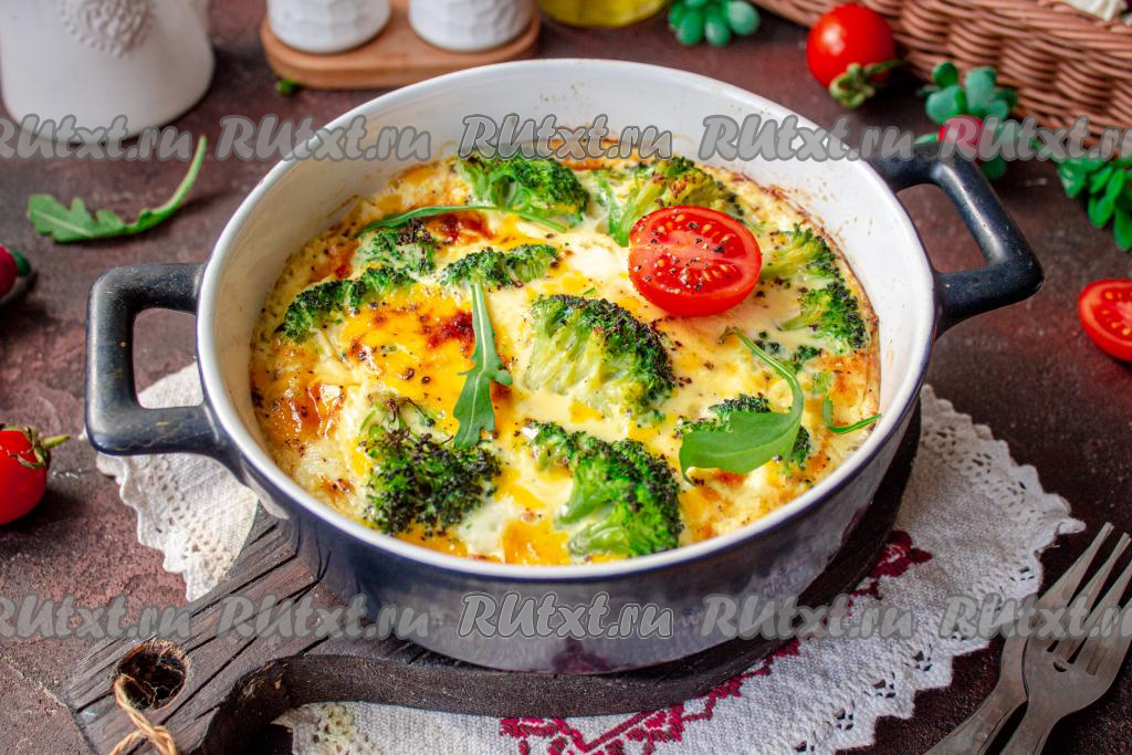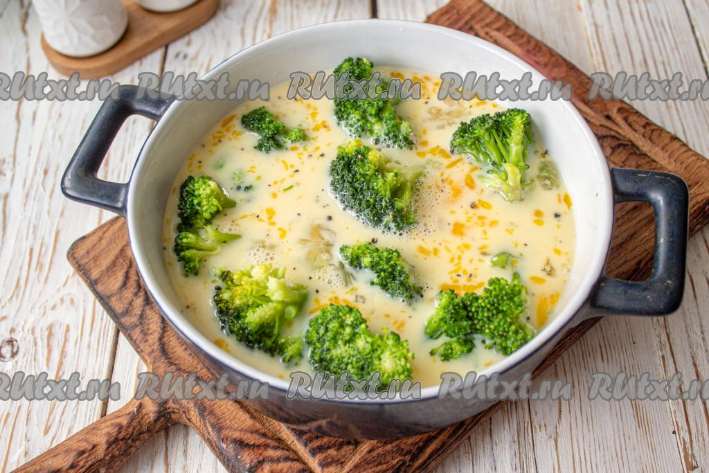 Яично-молочную смесь вылейте на брокколи. Поставьте омлет в заранее разогретую до 180-190 градусов духовку на 25-30 минут.