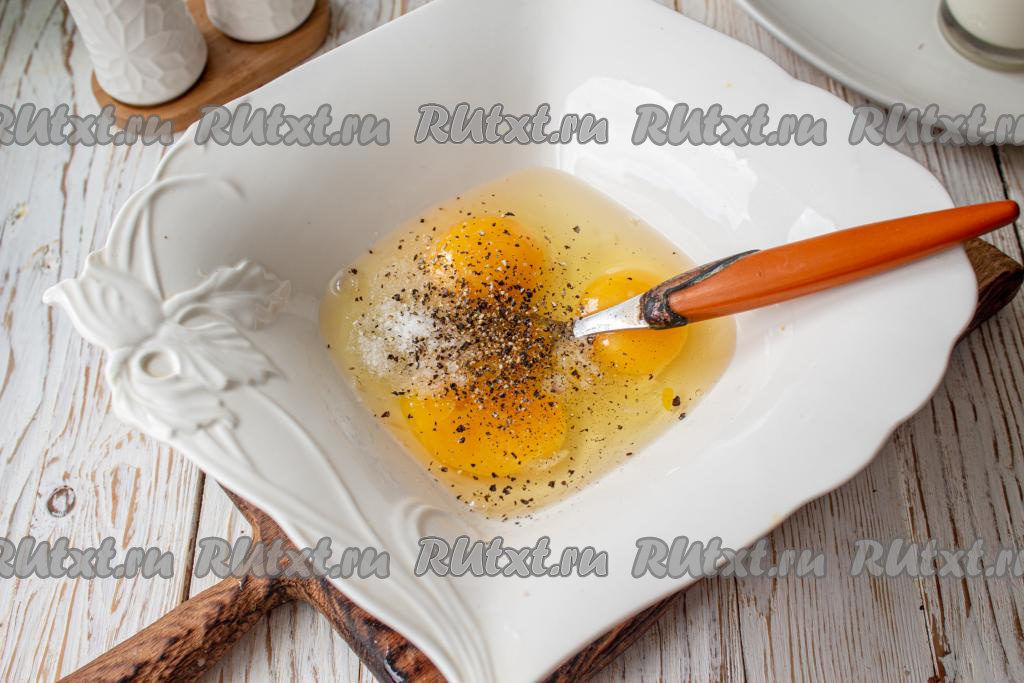 В миску вбейте яйца, добавьте к ним соль и чёрный молотый перец, перемешайте вилкой (или венчиком).