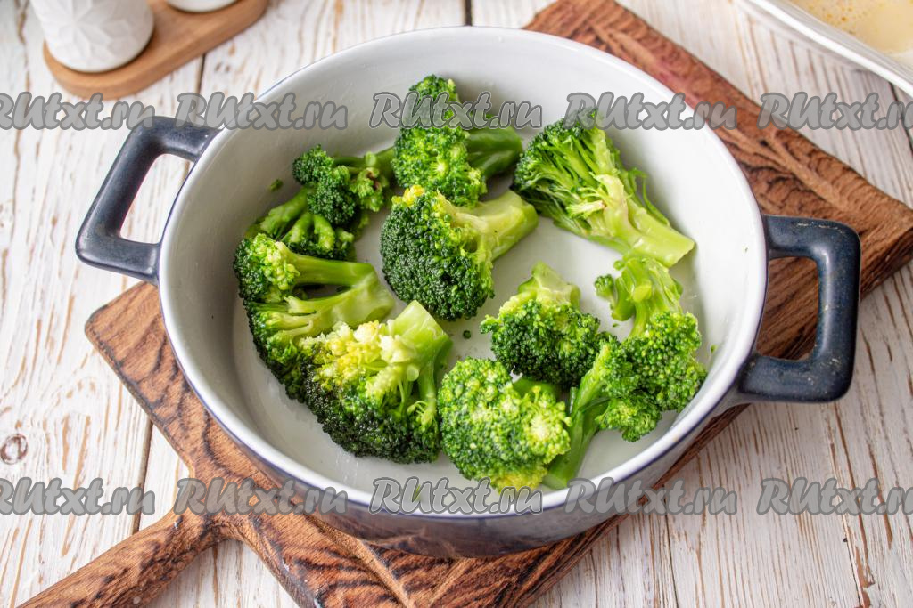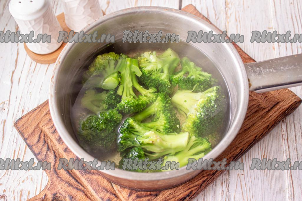 Замороженную (или свежую) капусту брокколи, разобранную на соцветия, выложите в кипящую подсоленную воду и варите минут 5. Затем откиньте на сито, чтобы стекла лишняя вода.