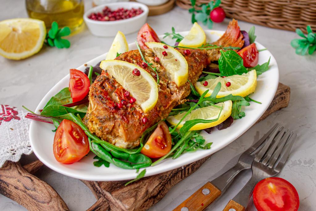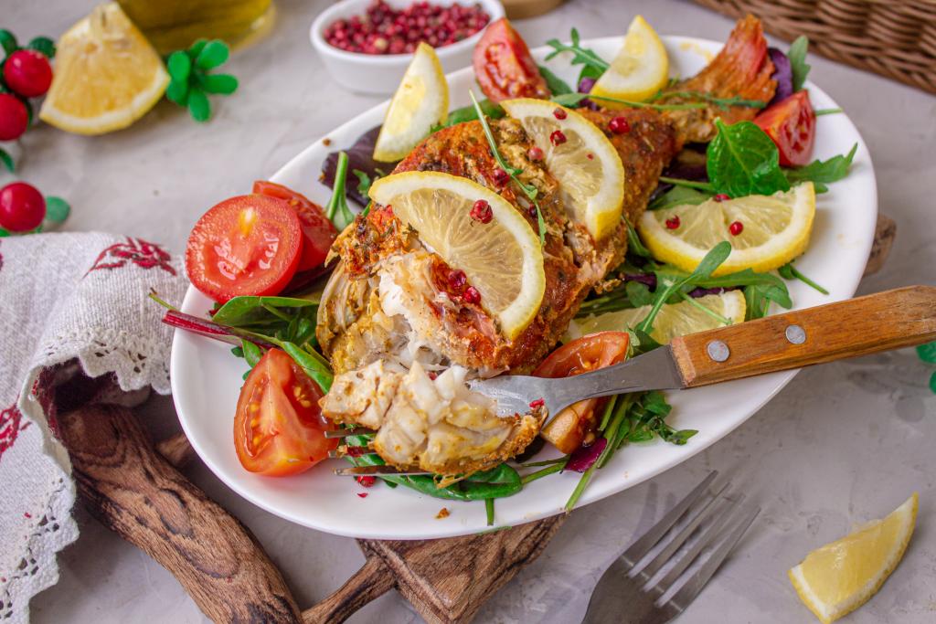 Вкусного, сочного морского окуня, запечённого в соевом соусе в духовке, подавайте с чем вам больше нравится (это может быть картофельное пюре, крупы, запечённые овощи или, как у меня, свежие листья салата, дольки лимона и овощи).