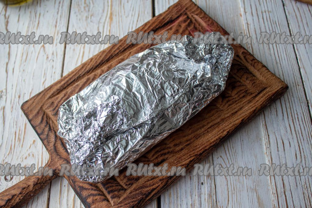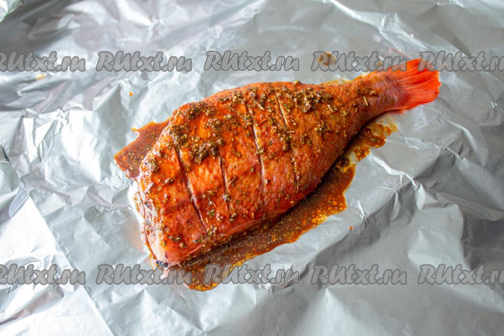 Выстелите 2 слоя фольги. Обильно смажьте рыбу со всех сторон и внутри маринадом, выложите на фольгу.