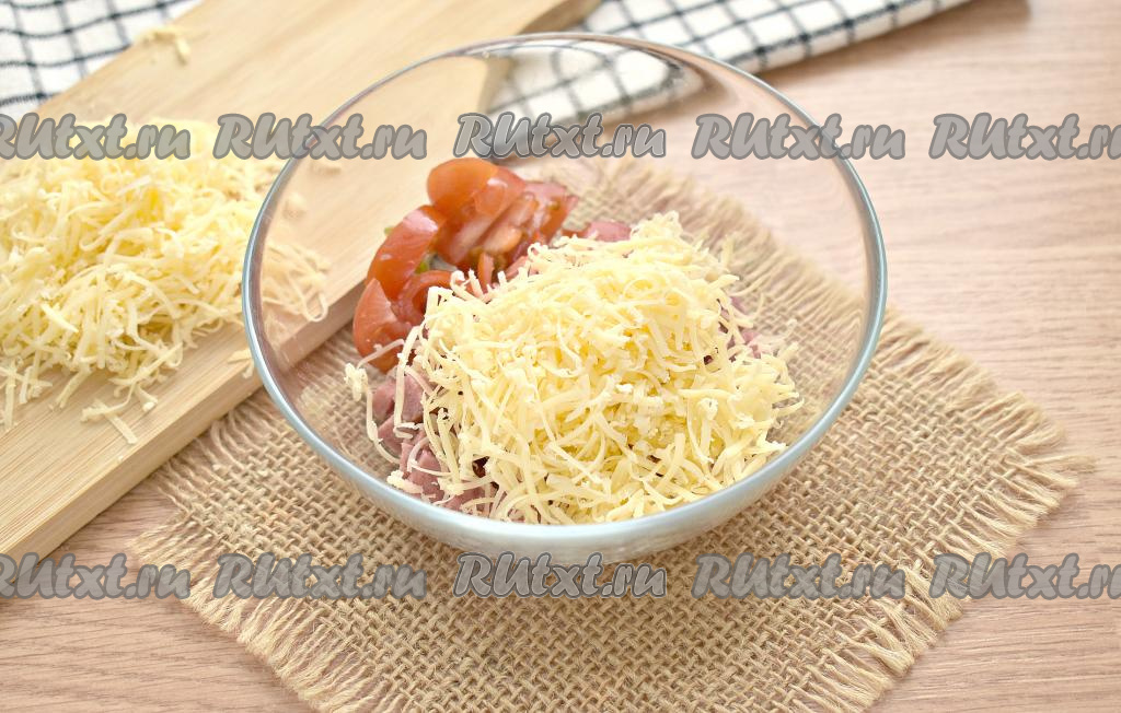 Сыр твёрдых сортов натираем на мелкой (или средней) тёрке. Половину сыра перекладываем в миску с колбасой и помидорами.