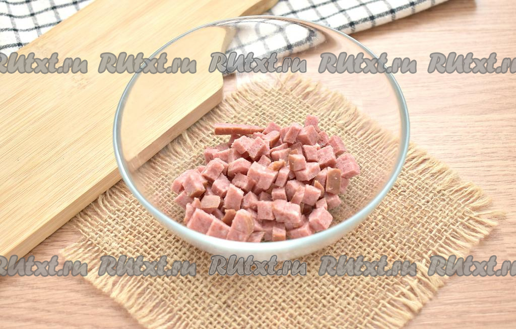 Нарезаем колбасу на мелкие кубики, перекладываем в миску.