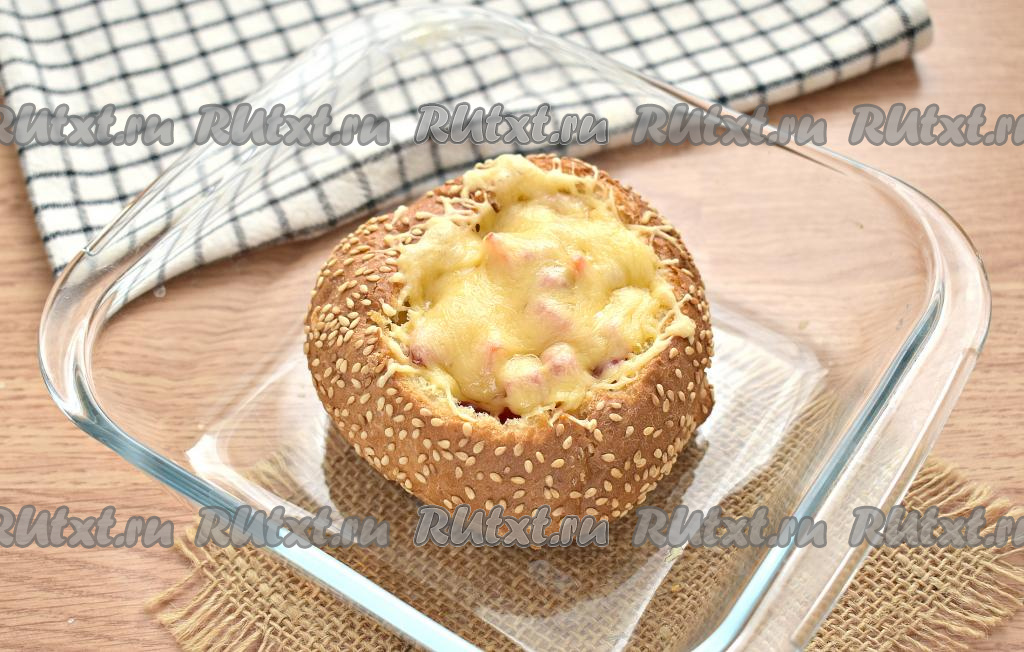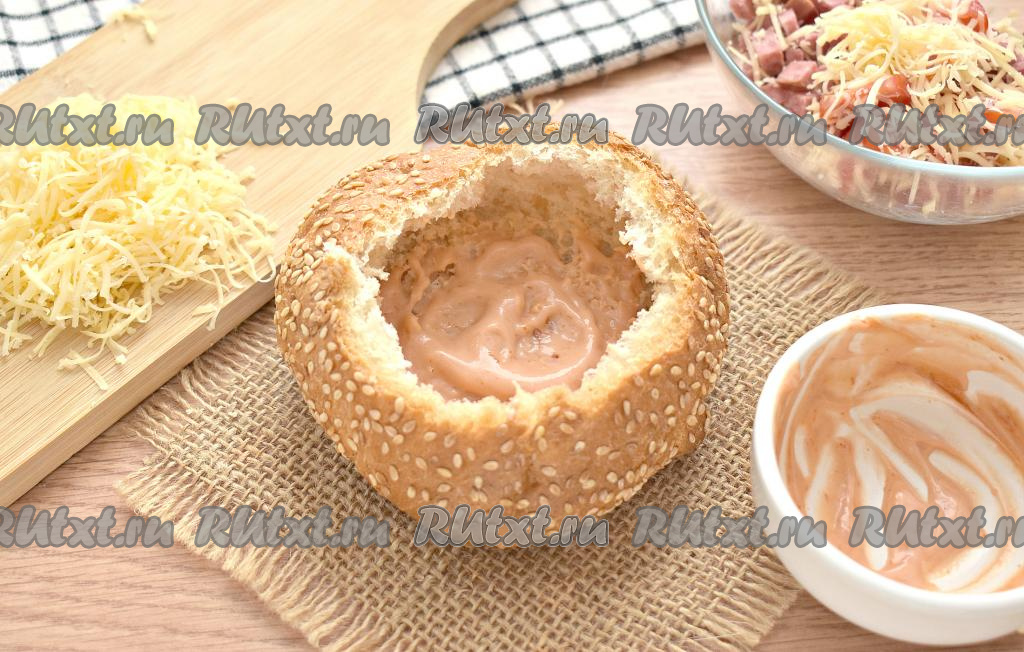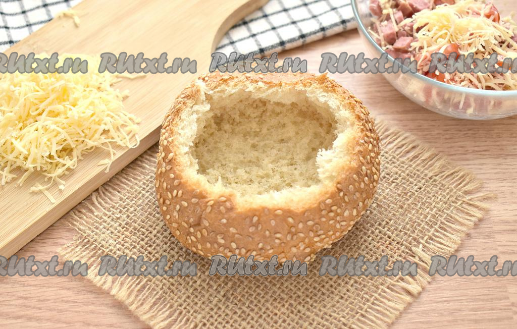 У булочки срезаем верхушку. Вынимаем мякиш (он может пригодиться, например, для котлетного фарша).
