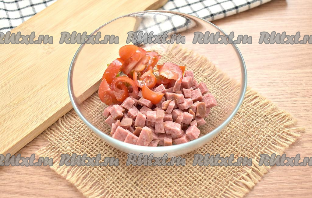 Помидоры, нарезанные на маленькие ломтики, добавляем к колбасе.