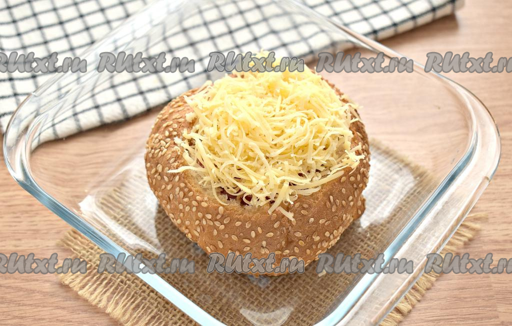 Помещаем булочку с начинкой в форму для запекания. Сверху начинку посыпаем оставшимся сыром.