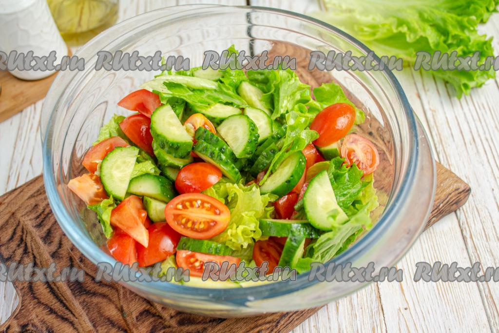 Помидоры черри и огурцы промойте, обсушите и нарежьте на небольшие кусочки, добавьте их к салату.