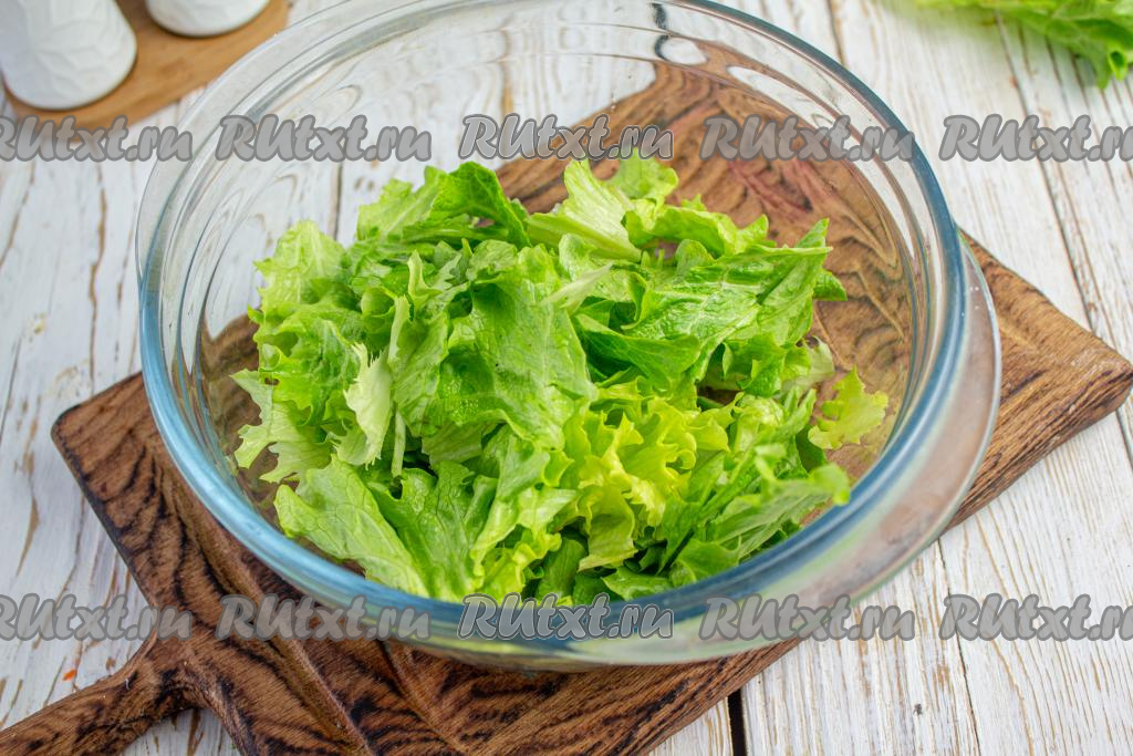Промойте и обсушите листья салата, затем порвите их руками на небольшие кусочки и сложите в салатник.