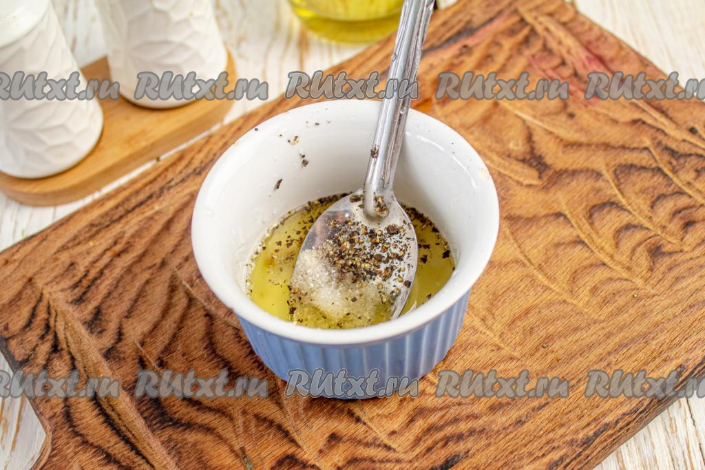 Смешайте масло, соль, лимонный сок и молотый чёрный перец в подходящей посуде и оставьте заправку "настояться" в течение нескольких минут.