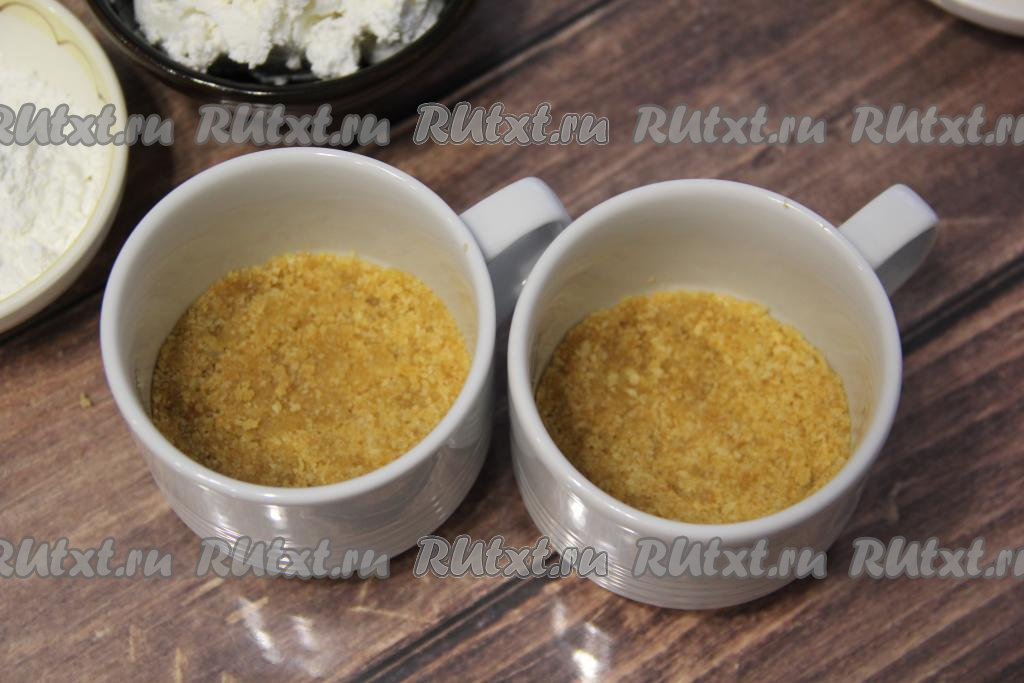 Подготовить продукты. Печенье измельчить в крошку. Сливочное масло растопить до жидкого состояния. Удобно растапливать масло в микроволновке, ставя на 30 секунд (не более), и затем обязательно проверяя масло, чтобы оно не перегрелось.