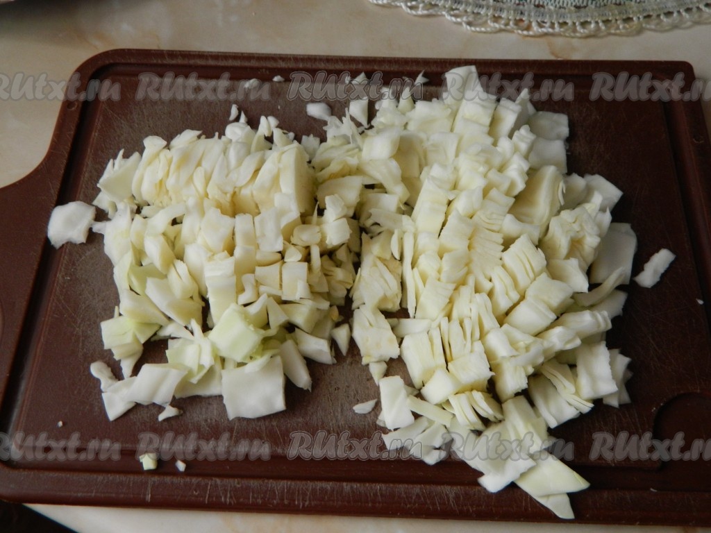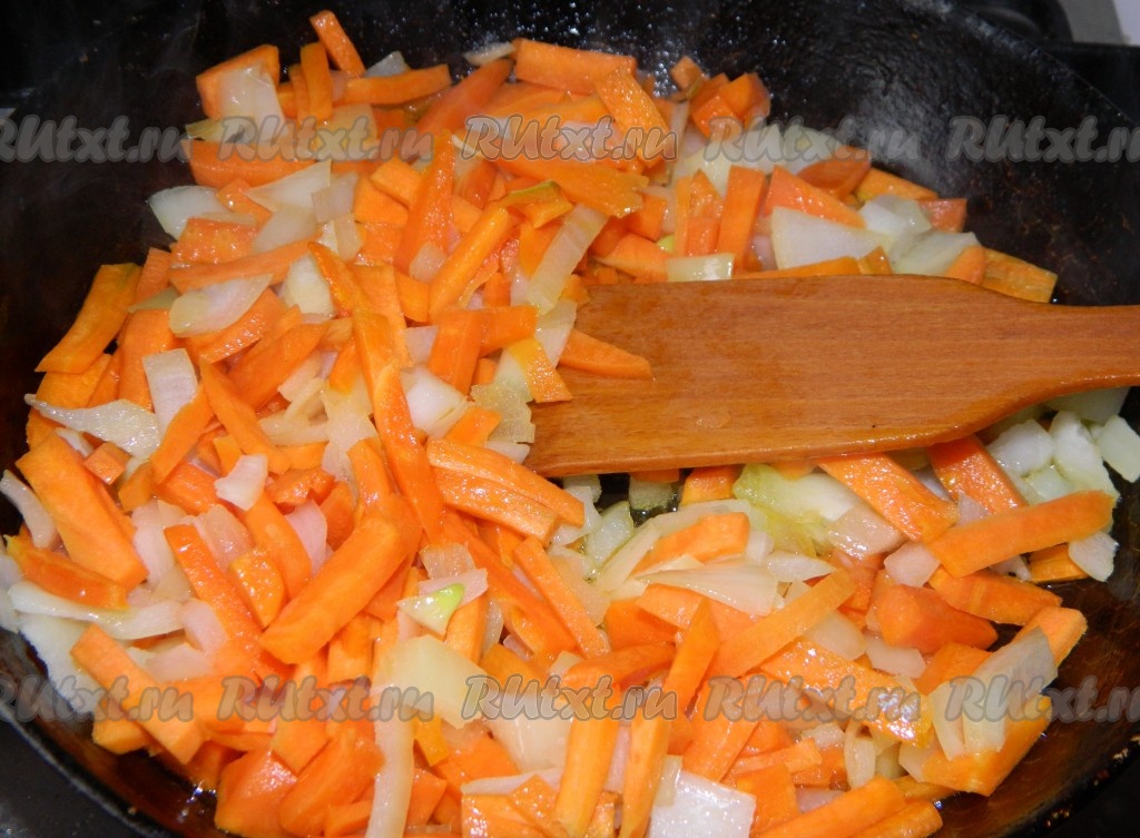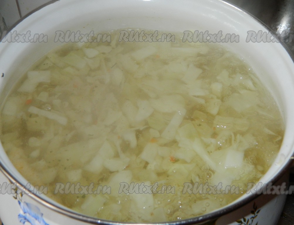 В кипящий бульон добавить капусту, обжаренные лук и морковь.