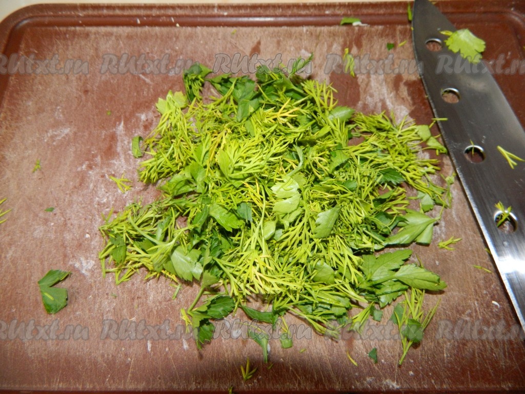 Мелко покрошить зелень и добавить в рассольник с капустой.