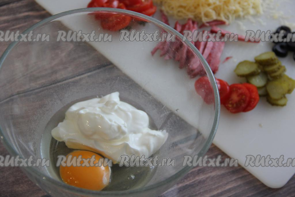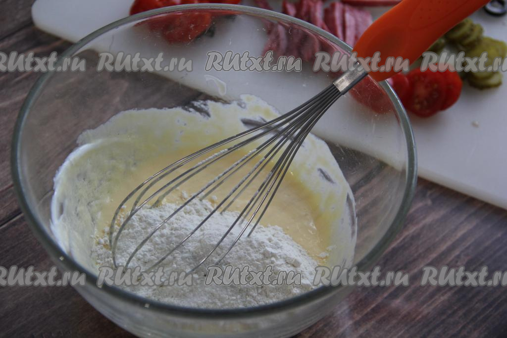 Перемешать сметану с яйцами венчиком, затем всыпать муку и соль.
