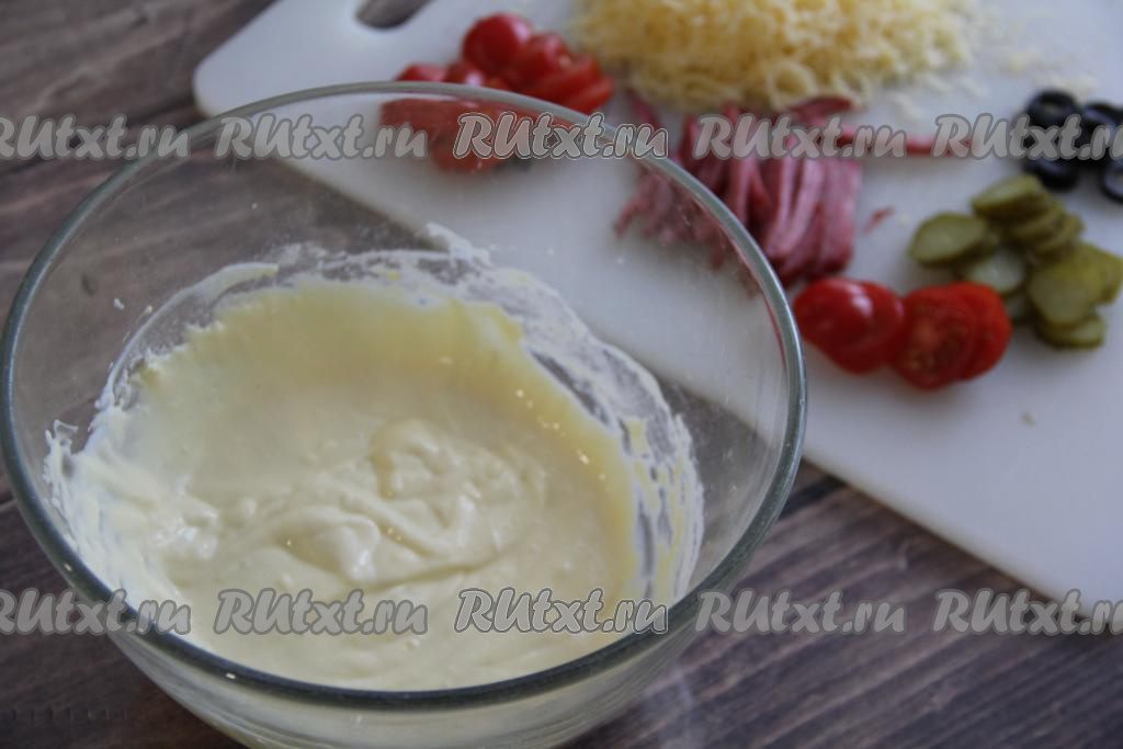Натереть на мелкой тёрке сыр. Колбаску нарезать на брусочки, огурчик и помидоры - на кружочки, маслины без косточек - на колечки.