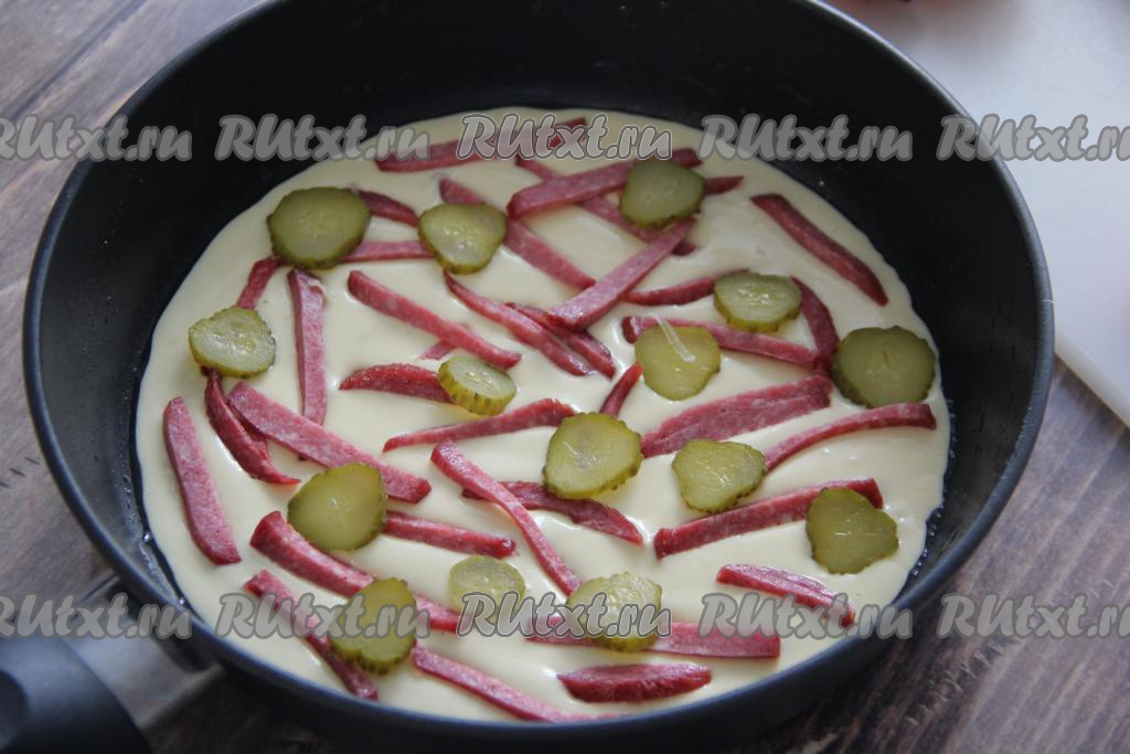 Поверх теста разложить кусочки колбасы и кружочки огурца.