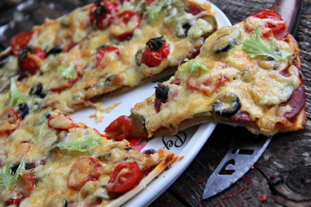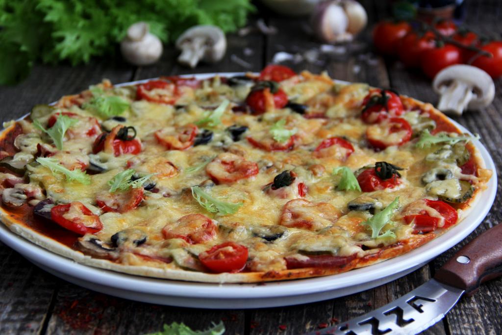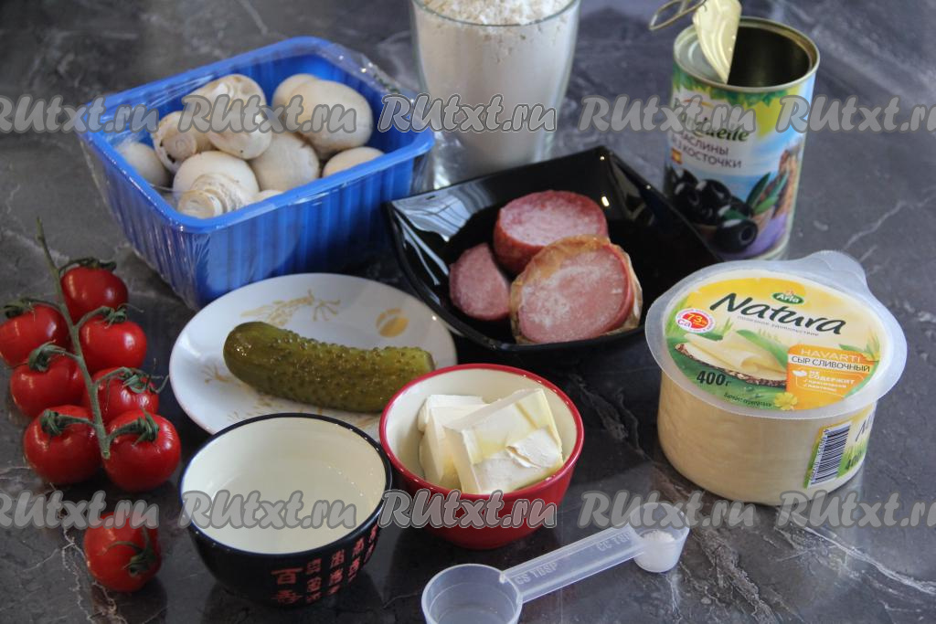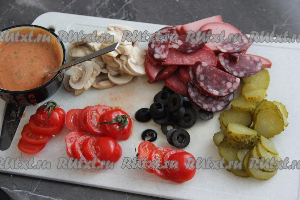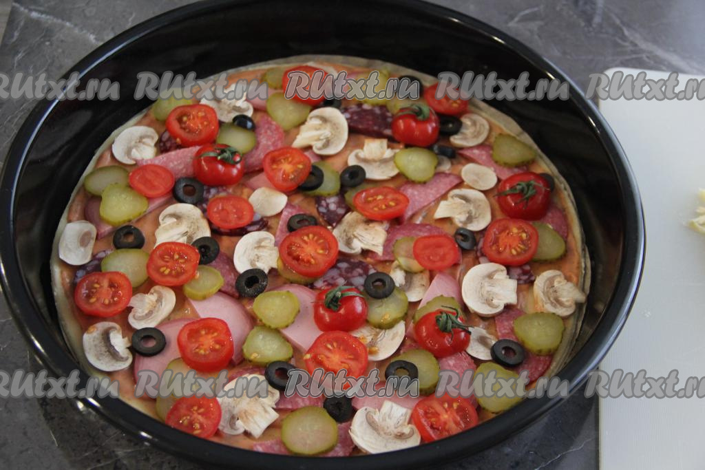Распределить колбасу, огурчики, шампиньоны, помидоры и маслины по основе пиццы.