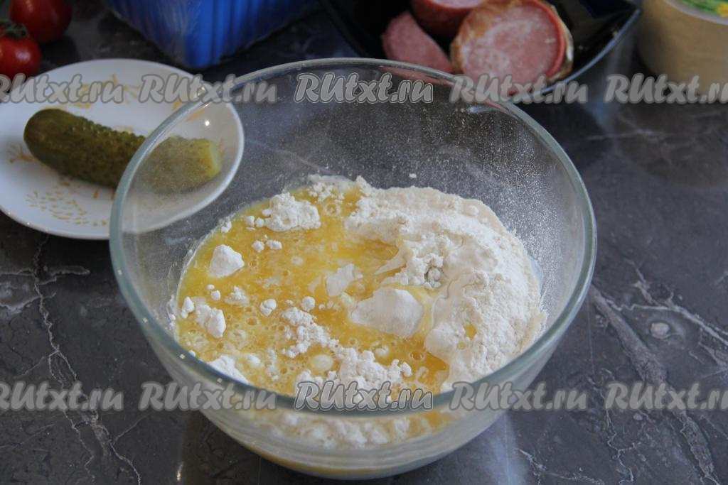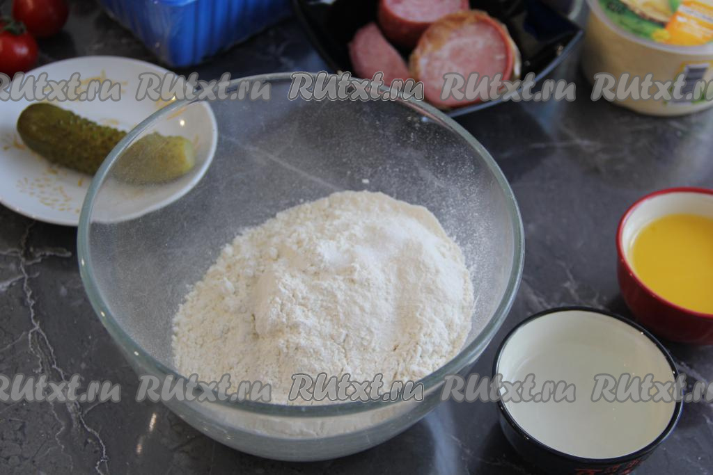 Когда всё для начинки готово, можно приступать к замешиванию бездрожжевого теста для пиццы. Для этого нужно соединить в миске просеянную муку и соль.