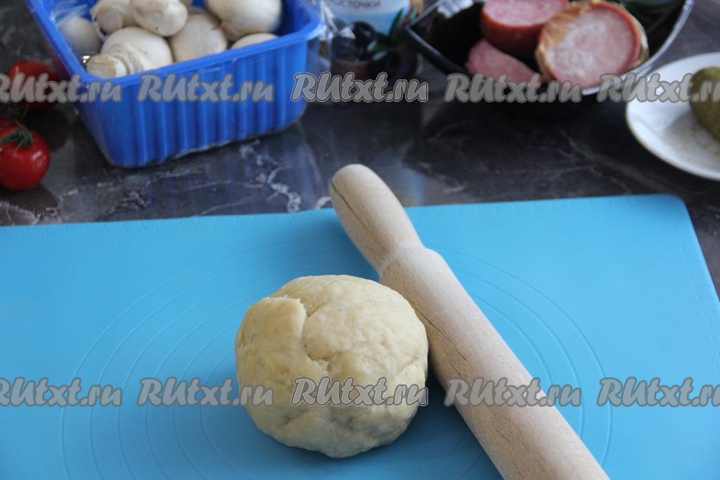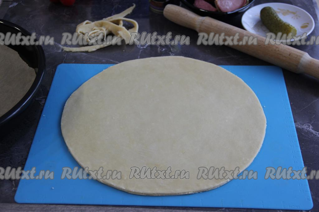 Раскатать тесто на присыпанной мукой поверхности скалкой в круг. Я раскатала в круг диаметром 30 см. Края обрезала для того, чтобы форма пиццы была более ровной.