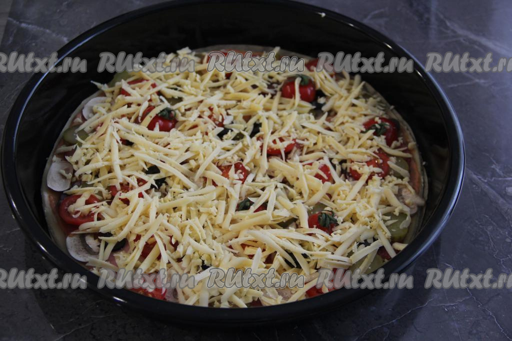Посыпать пиццу сверху натёртым сыром.