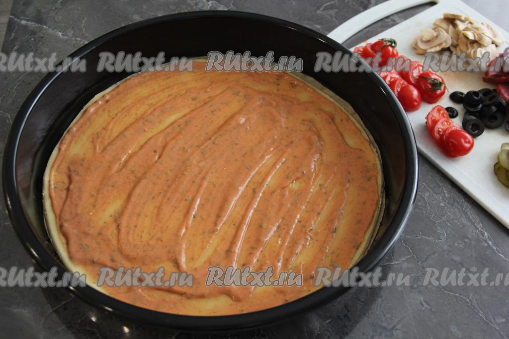 Переложить основу пиццы на противень. Я дно противня застелила пергаментом. Смазать основу заранее подготовленным соусом из кетчупа и майонеза.