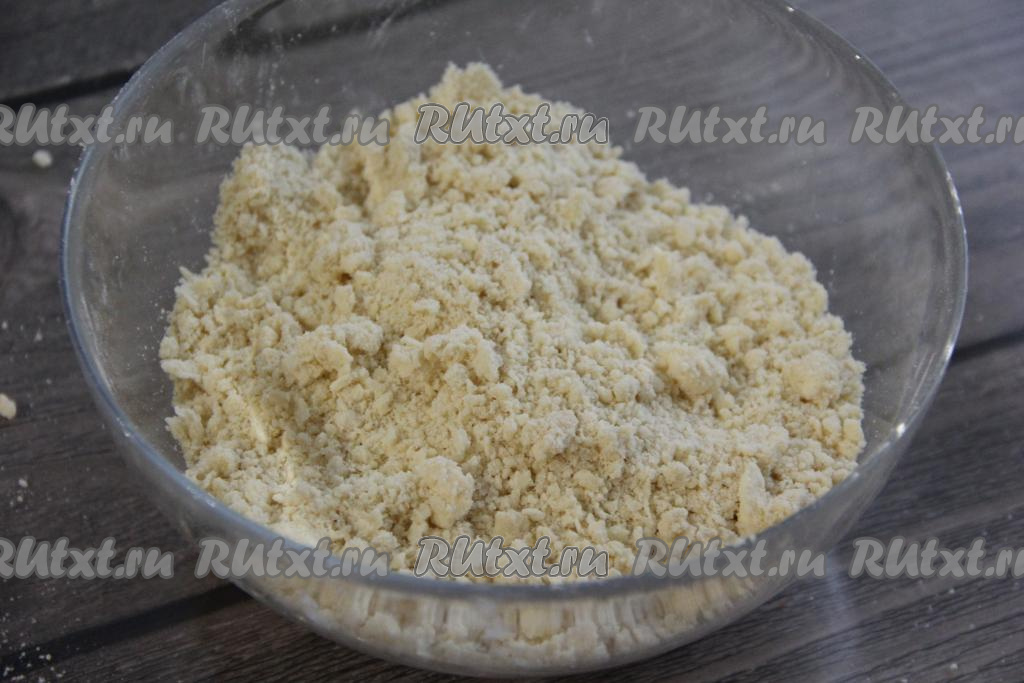Перетереть руками масло с сухими ингредиентами до получения мелкой крошки.