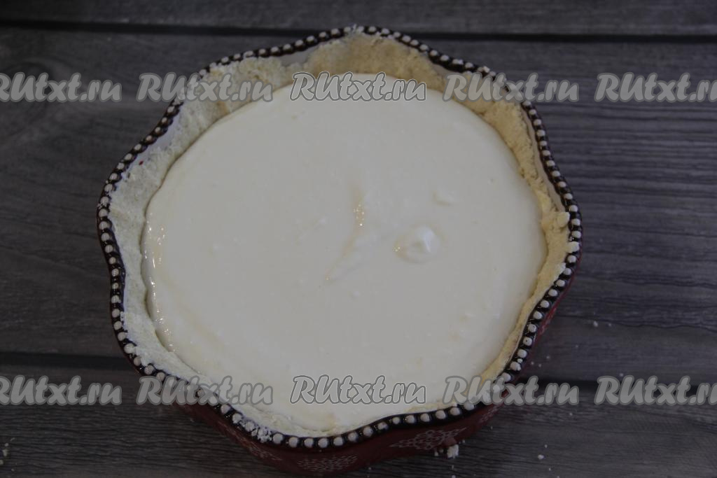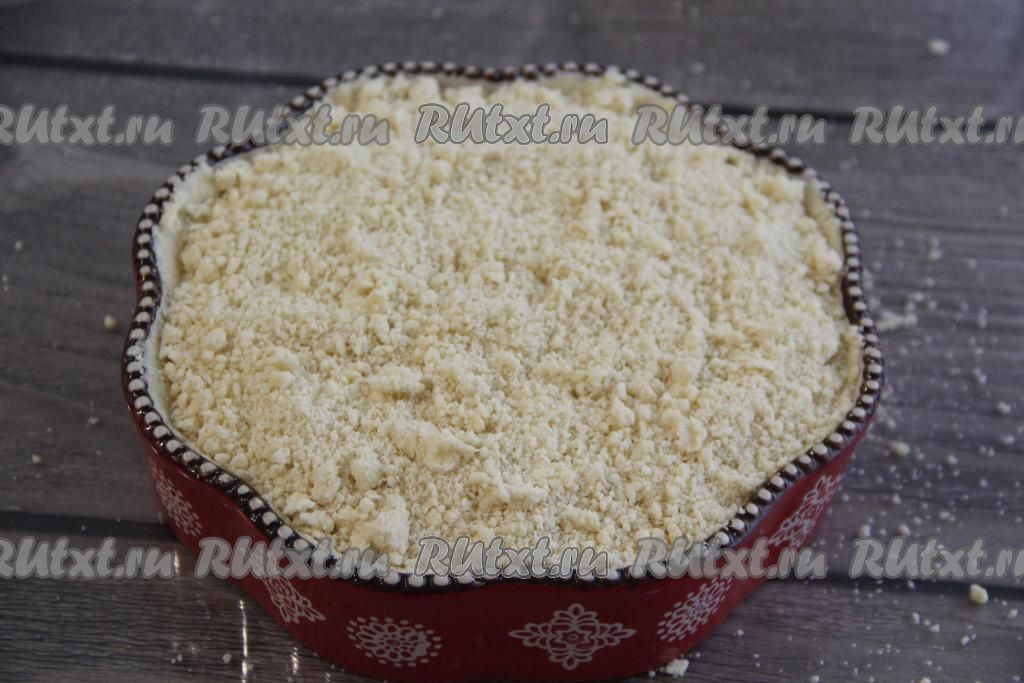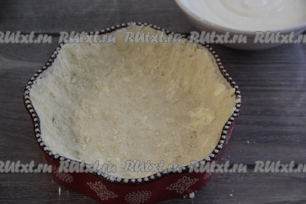 Выложить большую часть крошки в форму для выпечки (я выпекала в форме диаметром 19 см) и утрамбовать, сформировав бортики. Часть крошки оставить для верхней посыпки.