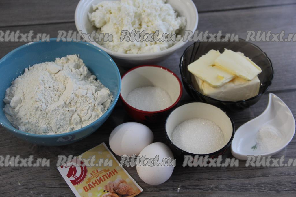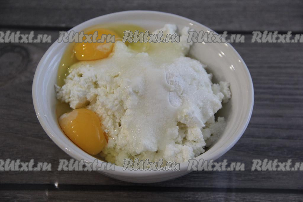 Подготовить творожную начинку, для этого в отдельной миске соединить творог, яйца, сахар и ванилин.