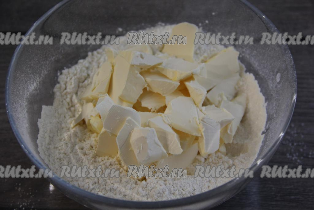 Вначале замесим тесто-крошку, для этого нужно соединить в объёмной миске муку, сахар и разрыхлитель, затем тщательно перемешать. В получившуюся смесь сухих ингредиентов выложить нарезанное на кусочки (или натёртое на тёрке) холодное сливочное масло.
