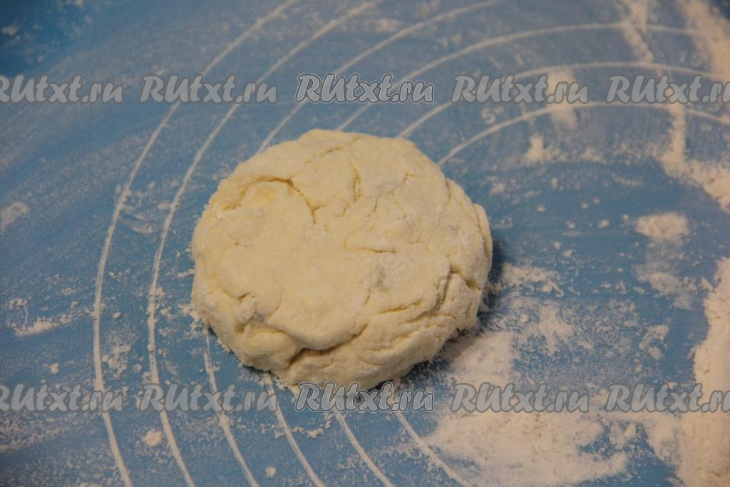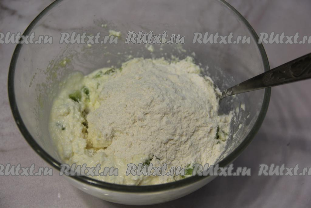 Перемешать массу и частями всыпать муку, каждый раз аккуратно вмешивая её в тесто. Всыпайте муку постепенно, небольшими порциями. Возможно, муки потребуется немного больше или меньше. Количество муки может зависеть и от влажности творога, и от сочности киви, и от величины яйца, и непосредственно от качества муки. Главное - ориентироваться на консистенцию замешиваемого творожного теста, оно должно быть слегка липким и будет напоминать не тесто, а именно творожную массу. У меня творог влажный и поэтому муки ушло 90 грамм.