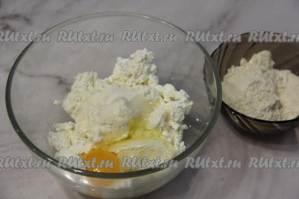 В творог добавить яйцо, соль и сахар, перемешать столовой ложкой (или вилкой) до получения однородной творожной массы.