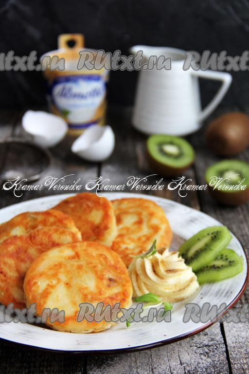 Подать очень вкусные, аппетитные сырники с киви к столу, дополнив вареньем или сметаной.