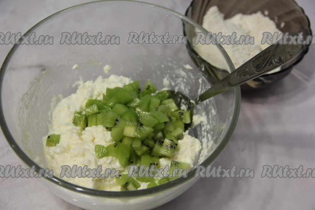 Киви почистить, нарезать на средние кубики и добавить в творожную массу.