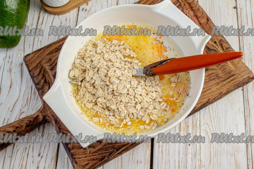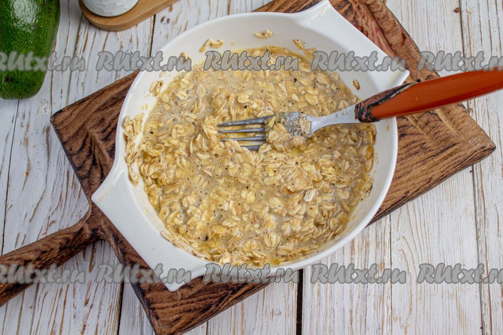 Перемешайте хлопья с молочно-яичной смесью. Тесто для овсяного блина получается средним по густоте.