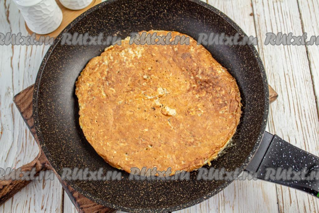 Сковороду диаметром 22-24 см хорошо нагрейте. Если у вас сковородка с хорошим антипригарным покрытием, то добавлять масло не надо. Ну а если вы не уверены в качестве своей сковороды, то смажьте её маслом. В прогретую сковороду вылейте тесто, тыльной стороной ложки распределите тесто по всему дну сковороды.