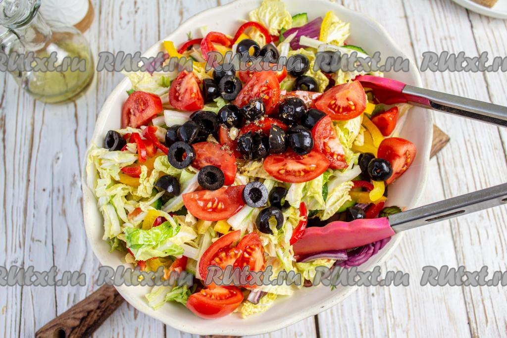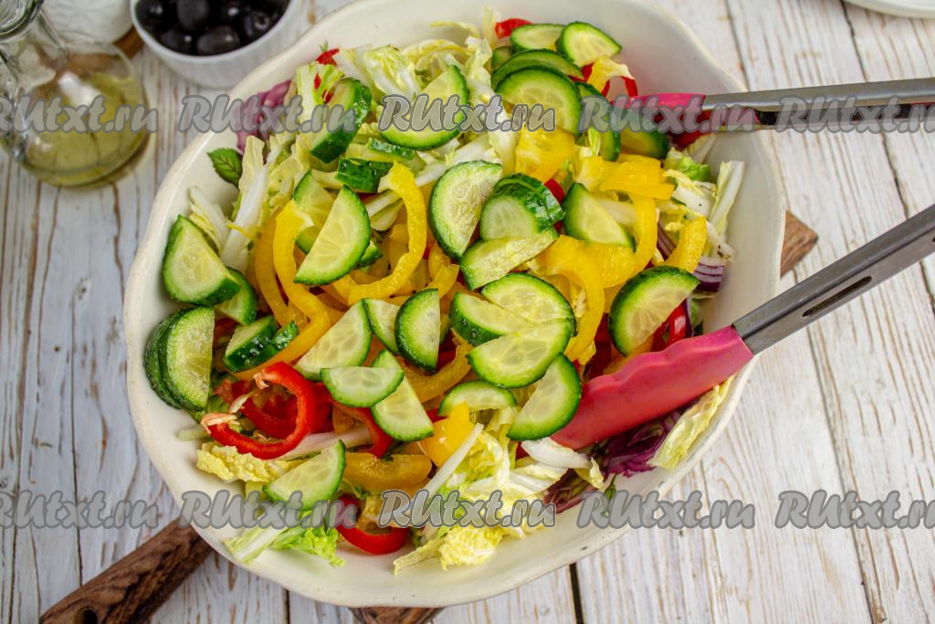 Перед порционной подачей полейте салат остатками заправки. Сочный, вкусный, яркий греческий салат с пекинской капустой подавайте сразу же к столу. Этот классический рецепт очень прост, а результат всегда удачный!