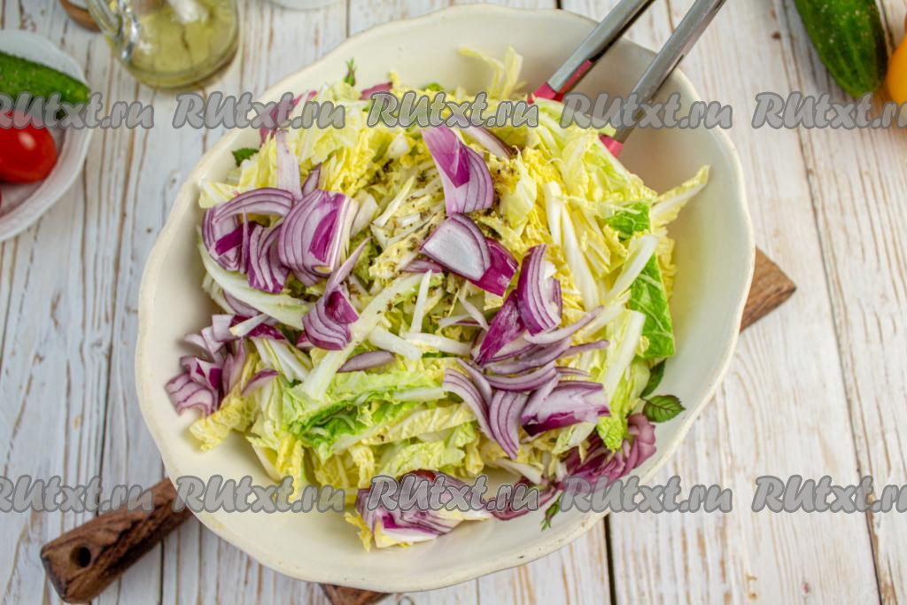 В большой салатник выложите нарезанную на тонкие полоски пекинскую капусту. Красный лук очистите, нарежьте тонкими перьями и добавьте к капусте. Полейте капусту с луком 1/3 частью заправки и перемешайте.