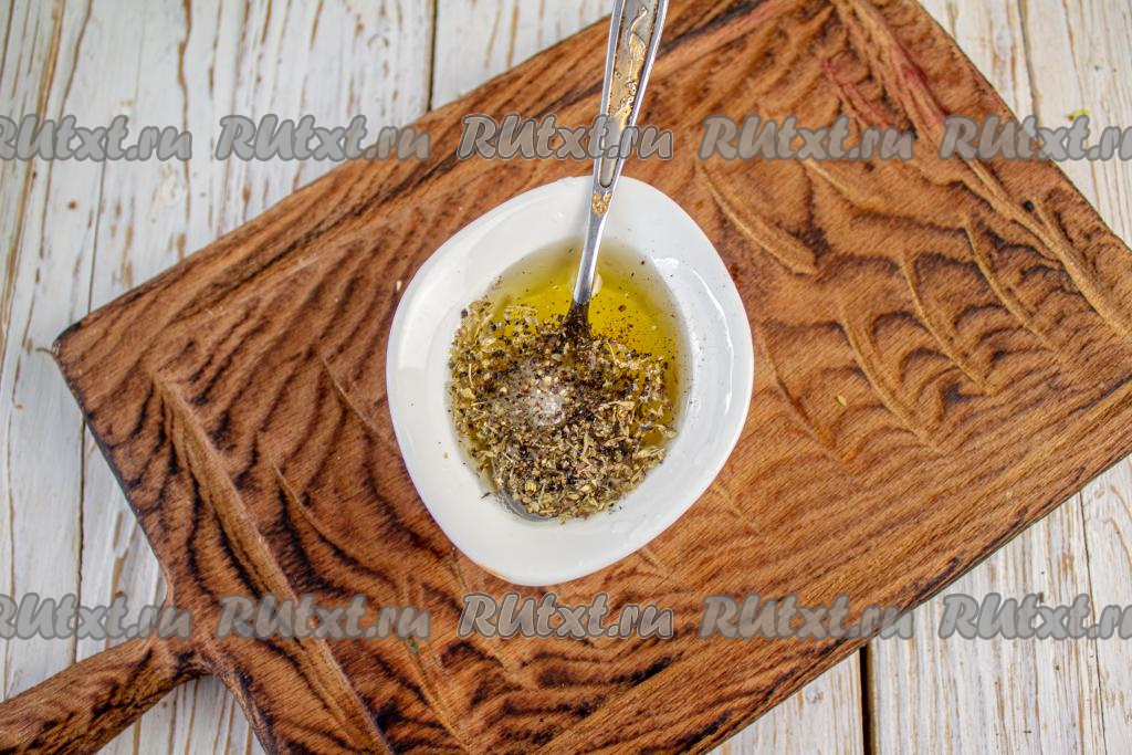 Первым делом приготовьте заправку, для этого смешайте оливковое масло, сок лимона, чёрный молотый перец, сушёные прованские травы и соль.