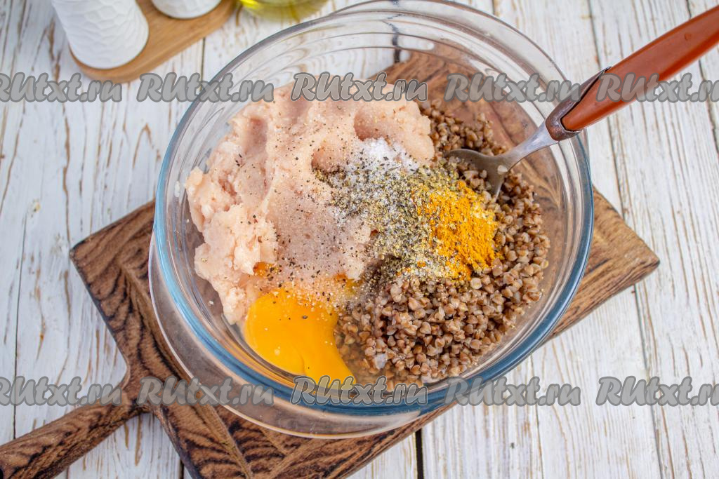 В миску выложите остывшую гречневую кашу, фарш и яйцо, посолите, всыпьте прованские травы, куркуму, сушёный (или пропущенный через пресс) чеснок, поперчите и перемешайте.