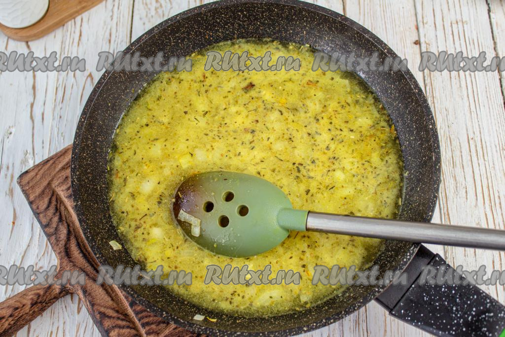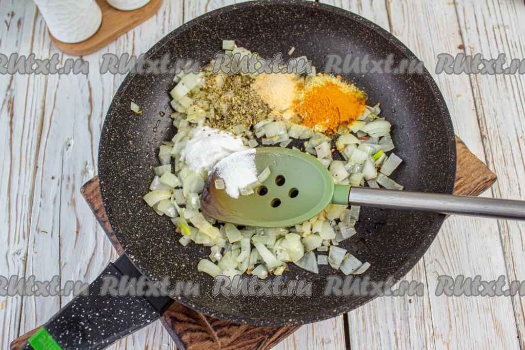 Когда лук станет мягким, выложите к нему муку, чёрный молотый перец, прованские травы, сушёный чеснок, карри порошок, соль, хорошо перемешайте и обжаривайте, помешивая, 2-3 минуты.