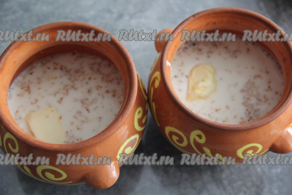 Соединить молоко с водой, перемешать. В каждый горшочек влить по 150 мл получившейся смеси молока и воды, добавить по 20 грамм сливочного масла.