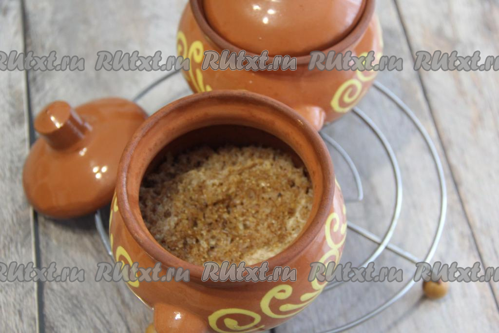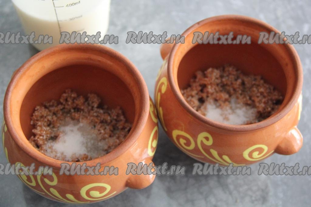 Разделить промытую пшеничную крупу на две части и разложить по двум горшочкам объёмом по 400 мл. Добавить в каждый горшочек 1/4 чайной ложки соли и одну столовую ложку сахара.
